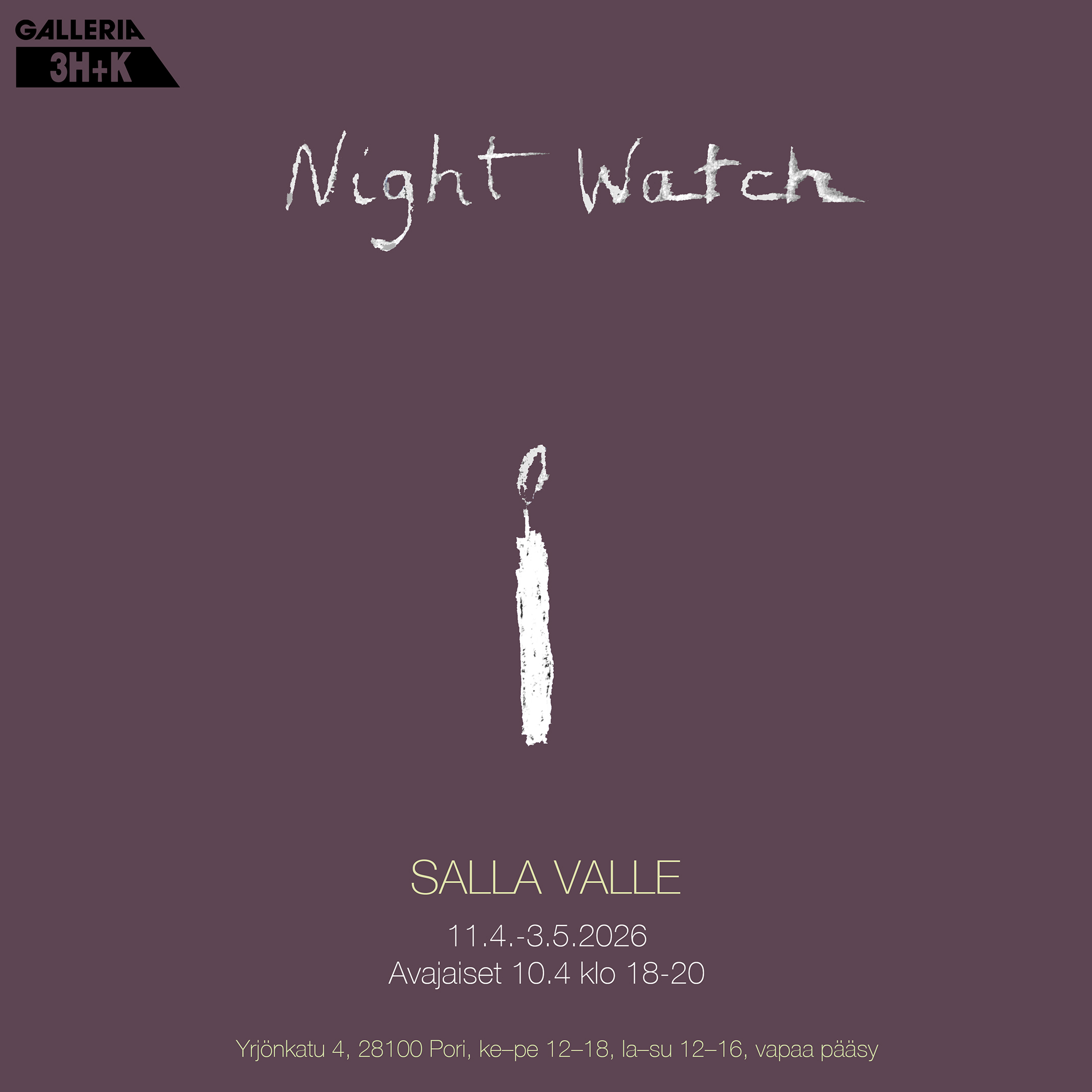 SALLA VALLE: NIGHT WATCHGALLERIA 3H+K 11.4.–3.5.2026 Tervetuloa avajaisiin perjantaina 10.4.2025 klo 18–20!“Havahduin sunnuntaiaamuna kello 10 kirkonkellojen soittoon. Nousin sängystä,kävelin ikkunalle, avasin verhot ja katsoin ulos, vaikkei äänessä sinänsä ollut mitäännähtävää.Odotin näkeväni messuun kiiruhtavan ihmisten virran, samanlaisen kuin silloin, kunSuomi voitti jääkiekossa ja kannattajien norot valuivat baareista ensin sivukaduille,sitten Unioninkadulle, jossa ne yhdistyivät vuolaaksi joeksi vyöryen kohti toria.Mutta katu oli tyhjä.” Night Watch on installaatioista ja lyijykynäpiirustuksista koostuva materiaalinentutkielma valosta, pimeydestä,…
